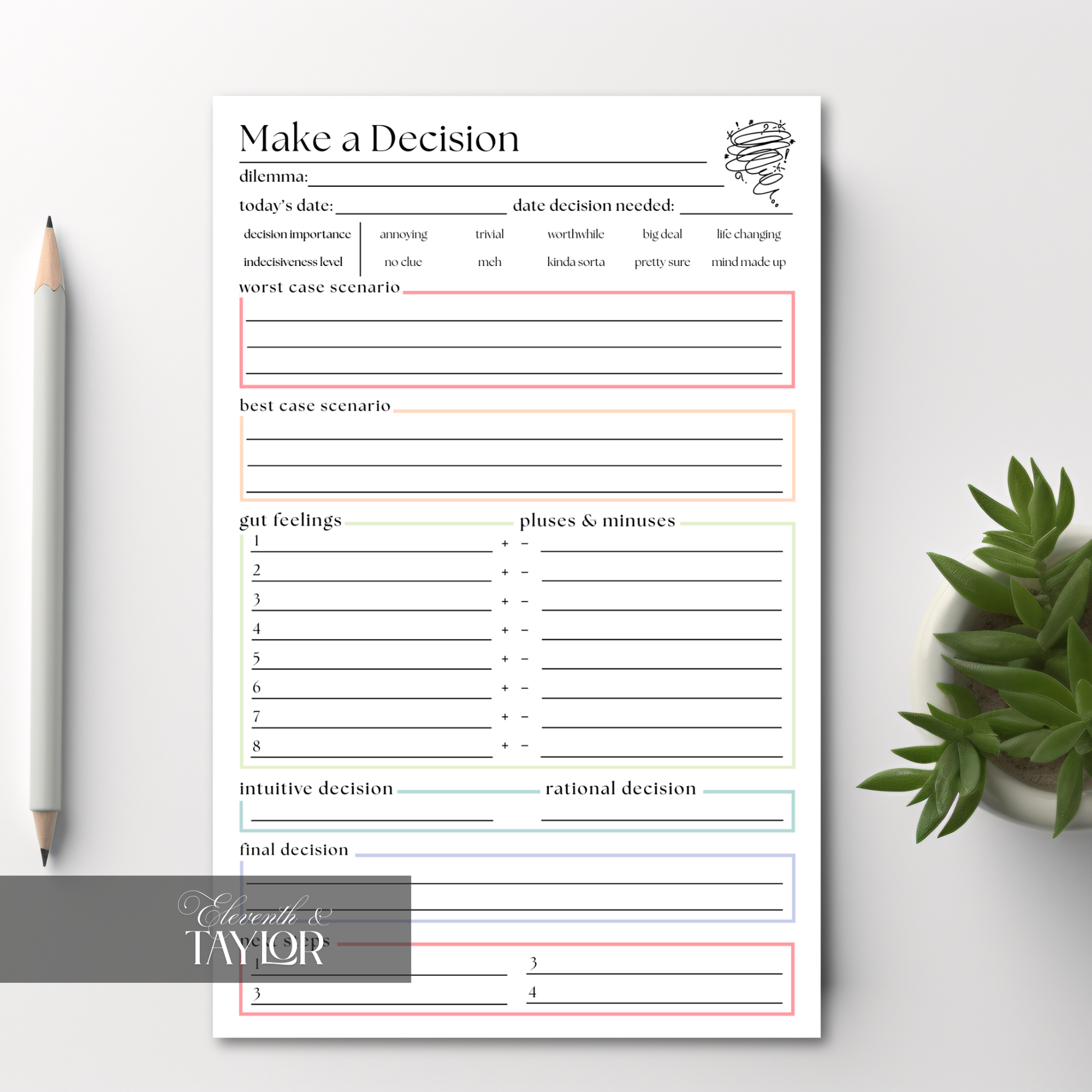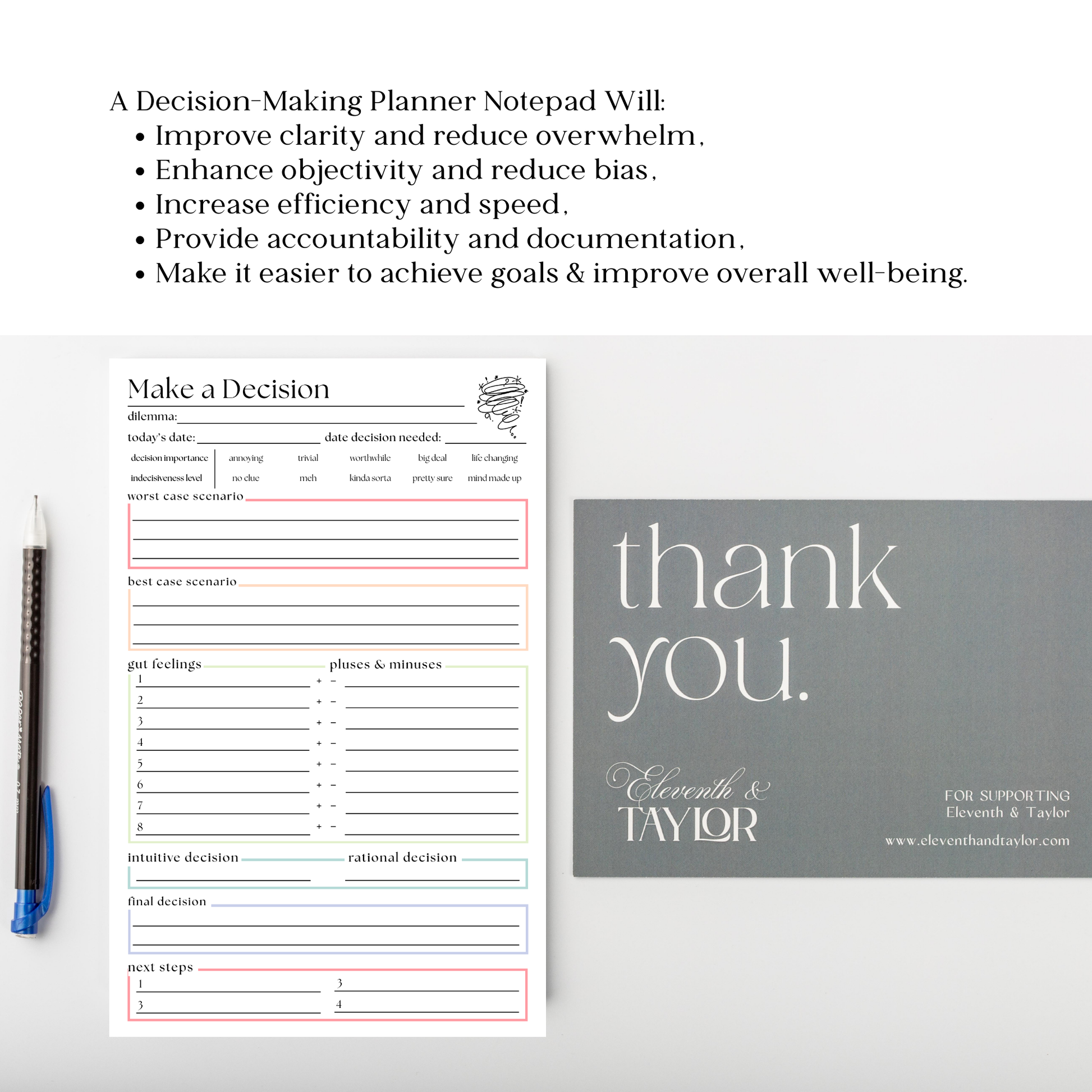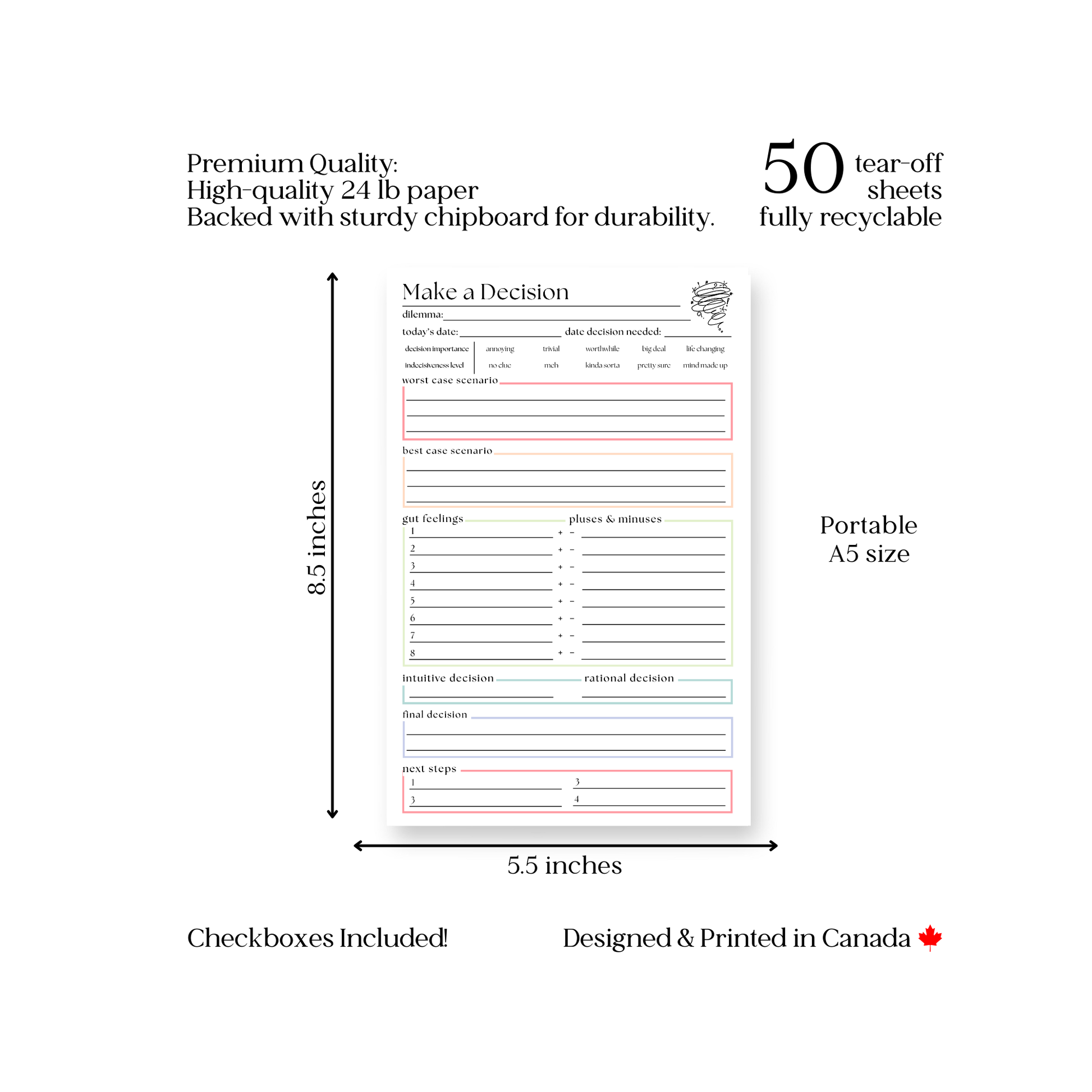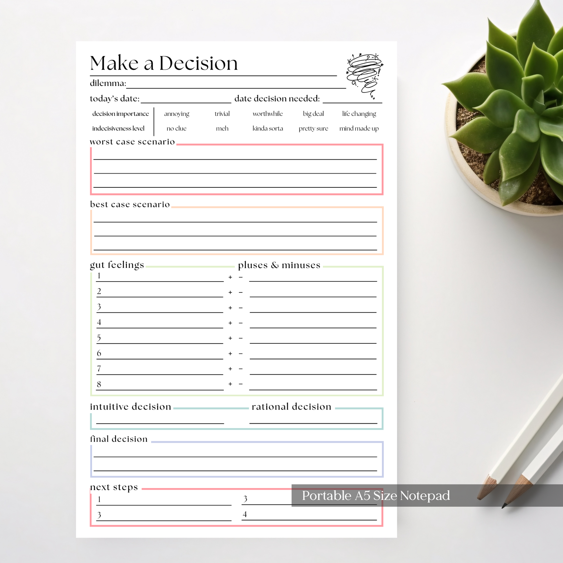 Our Decision Maker Pad will become your memory prompt, organizer aid, and visual motivator. Clear your mind of all those thoughts cluttering your mind. Increase your quality of life, reduce your stress, and take steps toward establishing and achieving your short and long term goals.